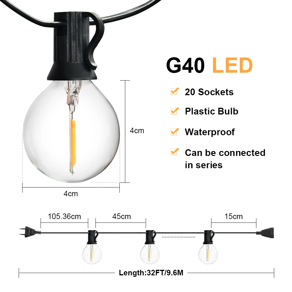 9,6 м сказочная гирлянда s, водонепроницаемая, ударопрочная Рождественская G40 пластиковая лампа, светодиодная гирлянда, уличная Ретро гирлянда светильник