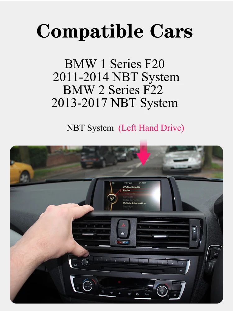 BMW серии 1 F20/F21 2011-2016 NBT системаBMW серии 2 F23 Cabrio 2013-2017 NBT системаЛевый и правый рульВеликобритания, Австралия, Сингапур, Ирландия и т. д. для правого руля следует заказывать модель RHDДля системы EVO 2018 года выпуска автомобиля, пожалуйста, сообщите нам меню вашего автомагнитолы, в вашем автомобиле есть оригинальный сенсорный экран, AUX или нет.