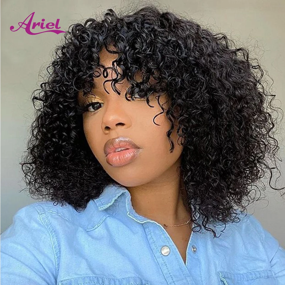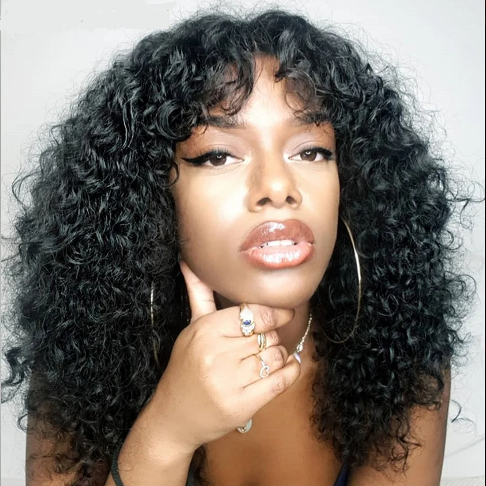 Парики из кудрявых натуральных малазийских волос с челкой, плотность 180, 200, кудрявые, полностью машинные, для чернокожих женщин