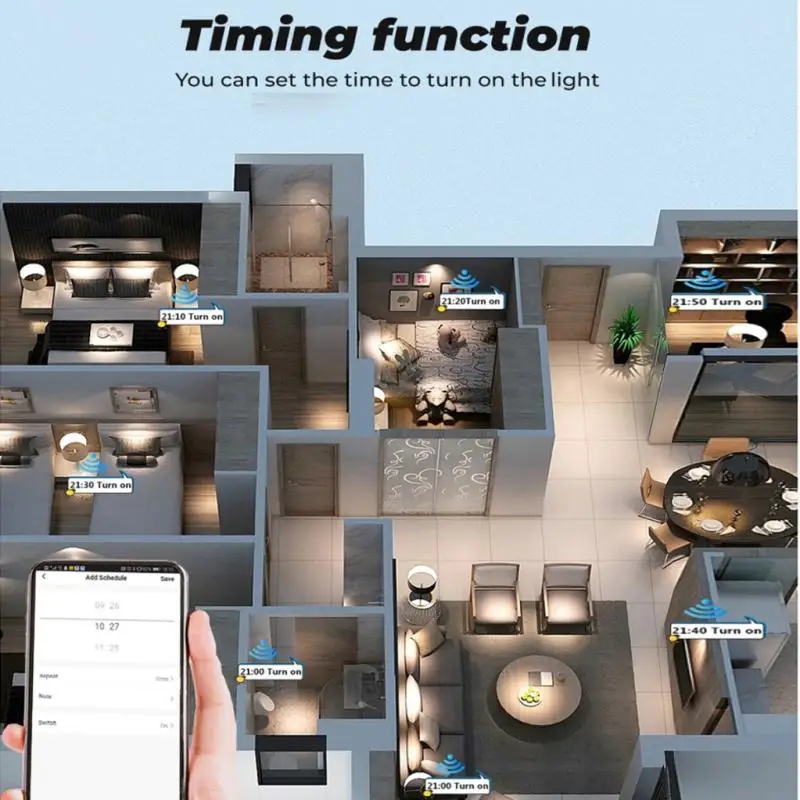 【Timing】 умный переключатель автоматически включается и выключается в данный момент времени через функцию таймера. Выберите время, когда вы хотите проснуться, автоматически Откройте светильник, чтобы вы могли легко войти в день; Выберите время, которое вы хотите закрыть светильник.