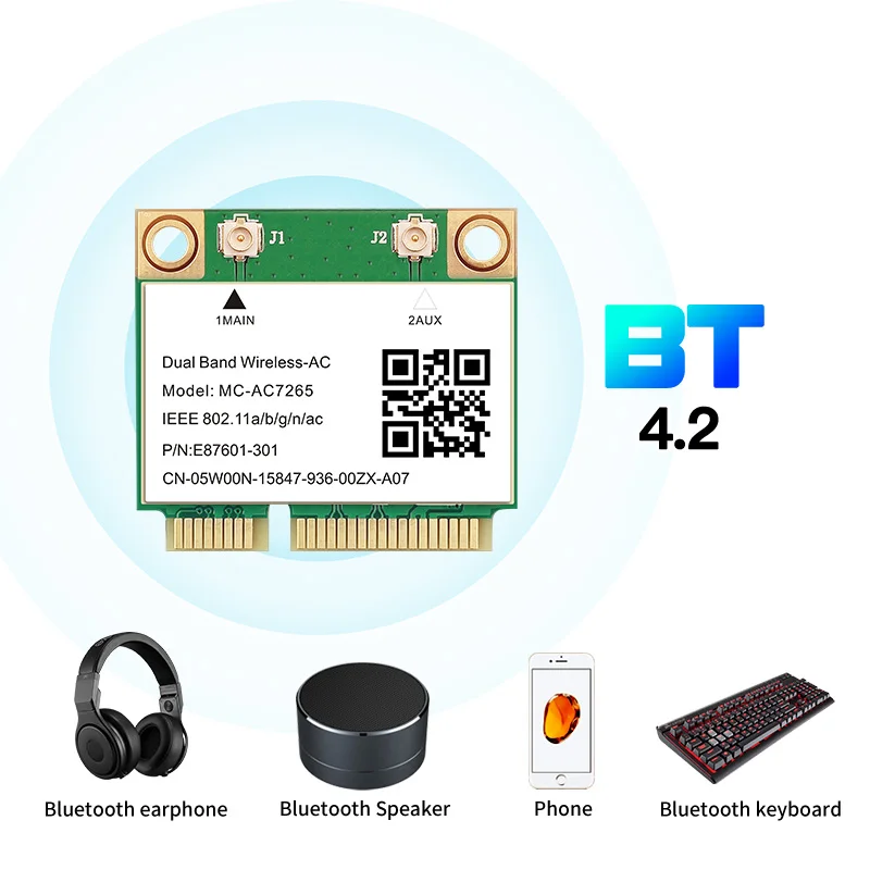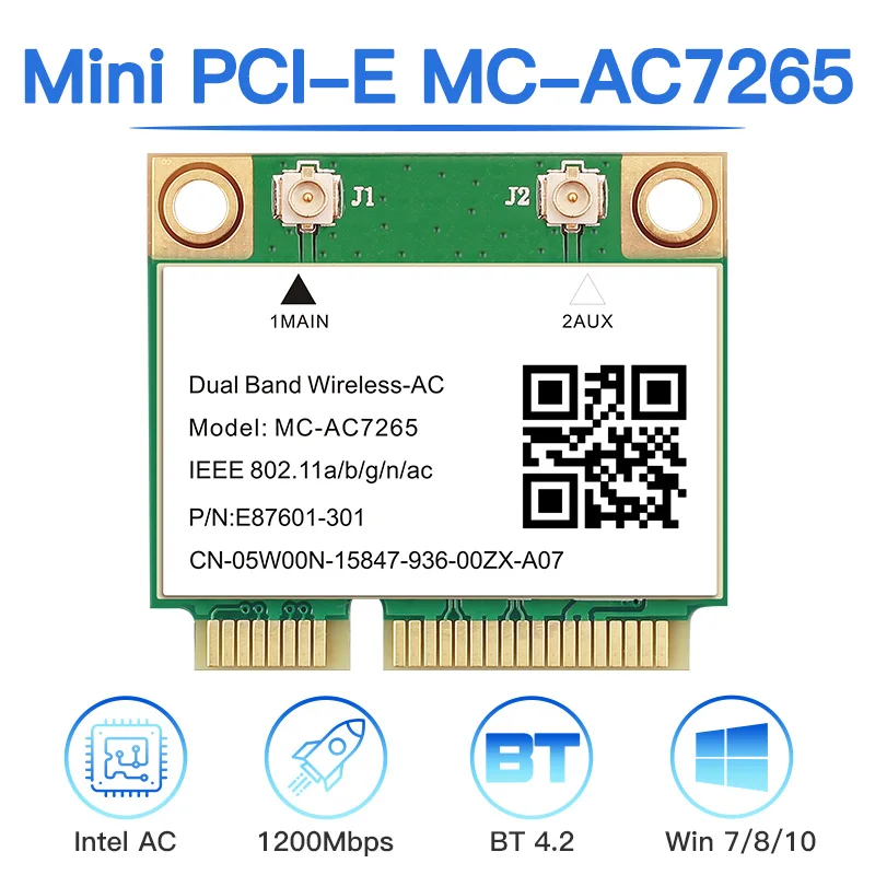 Описание:1. Модель: MC-AC72652. Интерфейс: Mini PCI-E;3.Dual band: 2,4 ГГц/5 ГГц4. Макс Скорость: 867 Мбит/с на Wi-Fi 5 ГГц, 300 Мбит/с на 2,4 ГГц5. Поддержка Bluetooth 4,2;6. Сетевой стандарт: 802.11ac; 802.11a/b/g/n;Совместимость с:1. Поддерживает почти ноутбук с интерфейсом Mini PCI-E, таким как Asus, Acer, Dell, Samsung, Toshiba, Sony и т. Д.2. Не подходит для ноутбука IBM/HP/Lenovo/ThinkPad