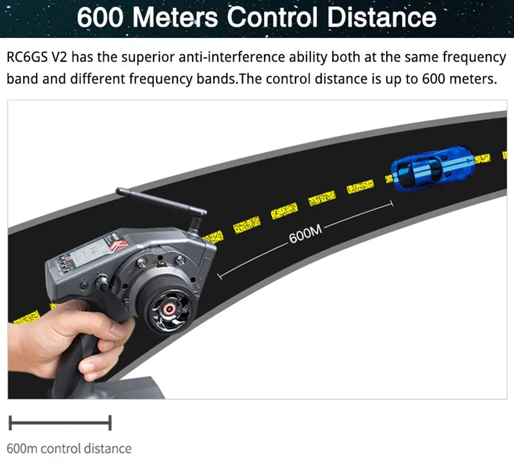 1. 【Отличный анти-интерференце】: реальный псевдо случайный алгоритм FHSS коммуникационная технология делает RC6GS V2 расстояние управления до 1900 футов (600 метров), И более 20 единиц RC6GS V2 могут работать одновременно в одном месте без каких-либо помех.
