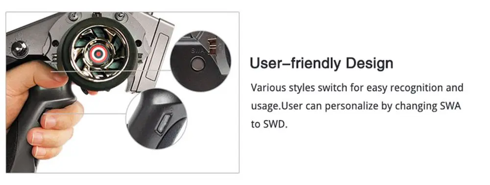 8. 【Superb эргономичный 】: форма ручки более линейная и удобная с эргономичным дизайном. Полоски на триггере увеличивают трогательное трение. Добавлен крюк, отверстие держателя монитора FPV, середина переключателя SWD ручки, пользователь может персонализировать, изменяя SWA на SWD.