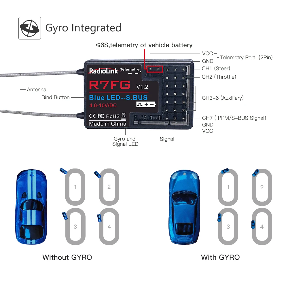 3. 【Встроенный Гироскопический: Встроенный гироскоп R7FG может держать автомобиль в прямой линии, а чувствительность гироскопа может регулироваться передатчиком, который подходит для дрейфующих и дорожных автомобилей.