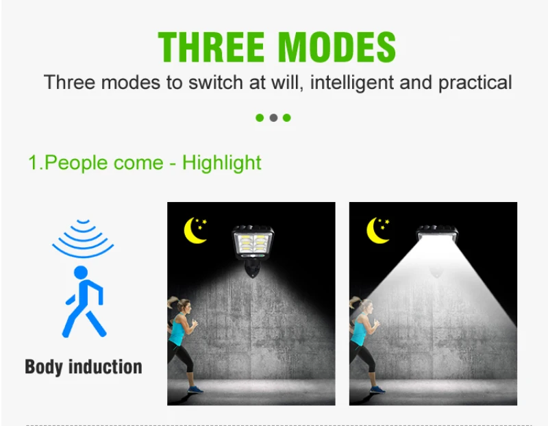 -Автоматическое включение: датчик движения PIR может сканировать источник тепла, который непрерывно перемещается в пределах диапазона обнаружения. Когда кто-то появится в области, светильник автоматически включится.