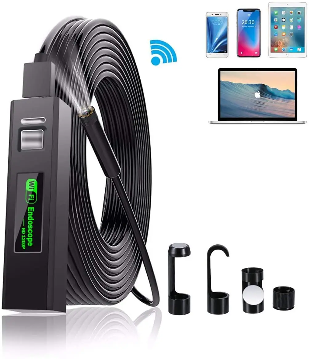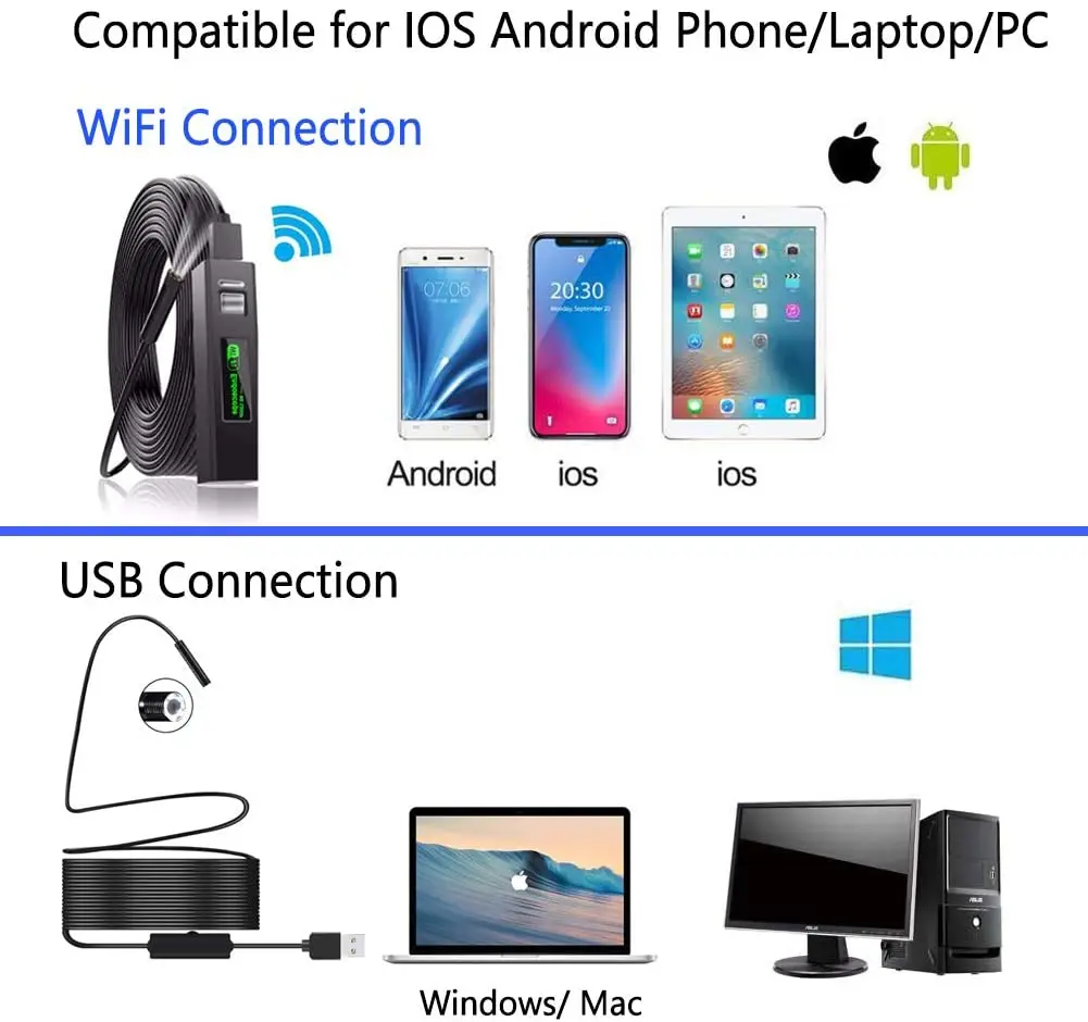 1. 【Новейший эндоскоп WiFi 】:В отличие от других эндоскопических камер на рынке, эта беспроводная эндоскопическая камера Wi-Fi работает не только со смартфоном Android (выше Android 2,3), но и с системой iPhone IOS (выше IOS 6,0). Это идеально подходит для пользователей iPhone, которые хотят провести инспекционную работу. Без использования дополнительного адаптера или кабеля, он может быть легко подключен к смартфону через WIFI. Единственное, что вам нужно сделать, это загрузить и установить совместимое приложение «WIFI look» на вашем устройстве.