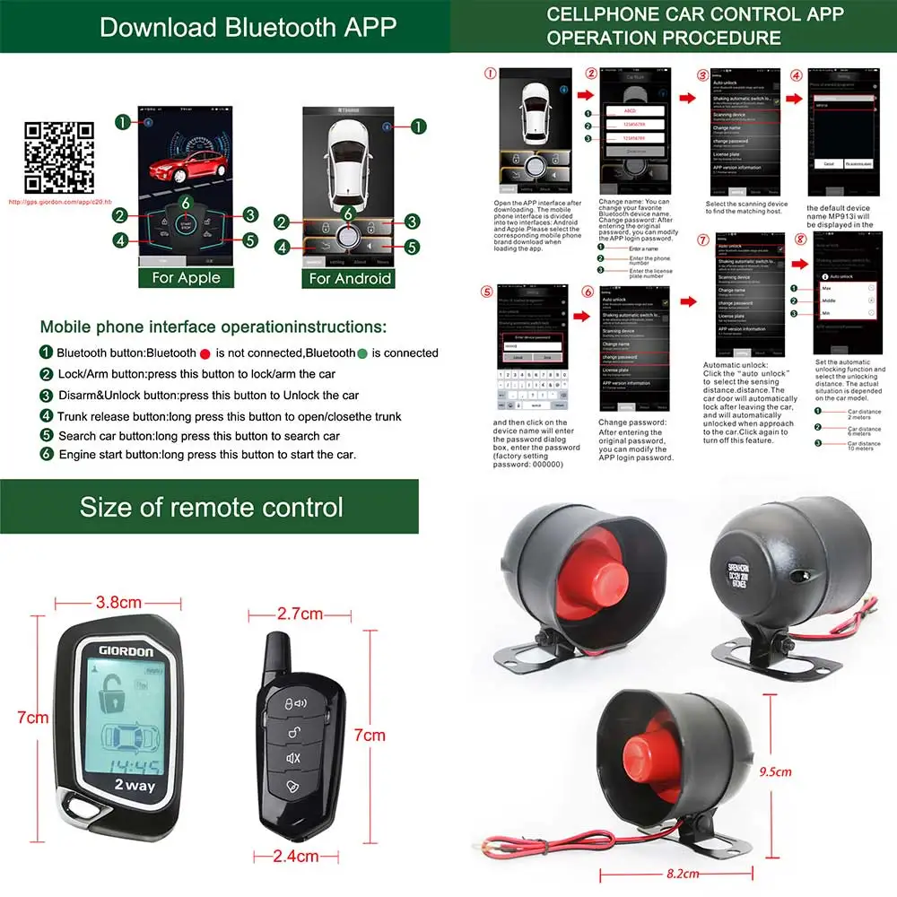 Это Двусторонняя Автомобильная сигнализация с ЖК-экраном, которая может дистанционно управлять запуском и остановкой двигателя, таймером запуска двигателя и датчиком вибрации. Этот продукт подходит для 95% бензиновых автомобилей DC12V на рынке. Продукт поставляется с инструкциями пользователя и схемами проводки на английском и русском языках.