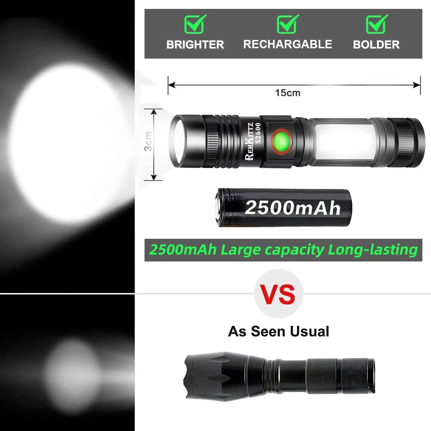 ✅【 Супер-яркий широкий BEAM】-S2600-самый яркий usb светильник REHKITTZ на рынке. Ультра широкий луч легко освещает всю комнату или задний двор. Он в 20 раз ярче старых ламп накаливания и имеет прочную конструкцию и мерцающую яркость. Этот usb фонарик имеет 4 режима (Высокий/низкий/Стробоскоп/COB режимы sidelight) идеально подходит для использования в доме, прогулки с собакой, рыбалки или механического осмотра.