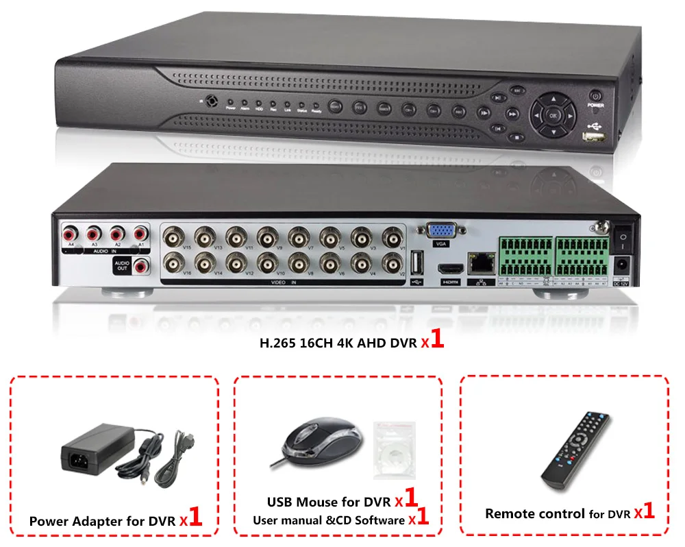 1 х H.265 16CH 4K 6 в 1 AHD DVR гибридный цифровой видеорегистратор;1 x Блок питания для DVR;1 X USB мышь для DVR;1 компакт-диск программного обеспечения для DVR;1 пульт дистанционного управления для DVR;Жесткий диск в комплект не входит!