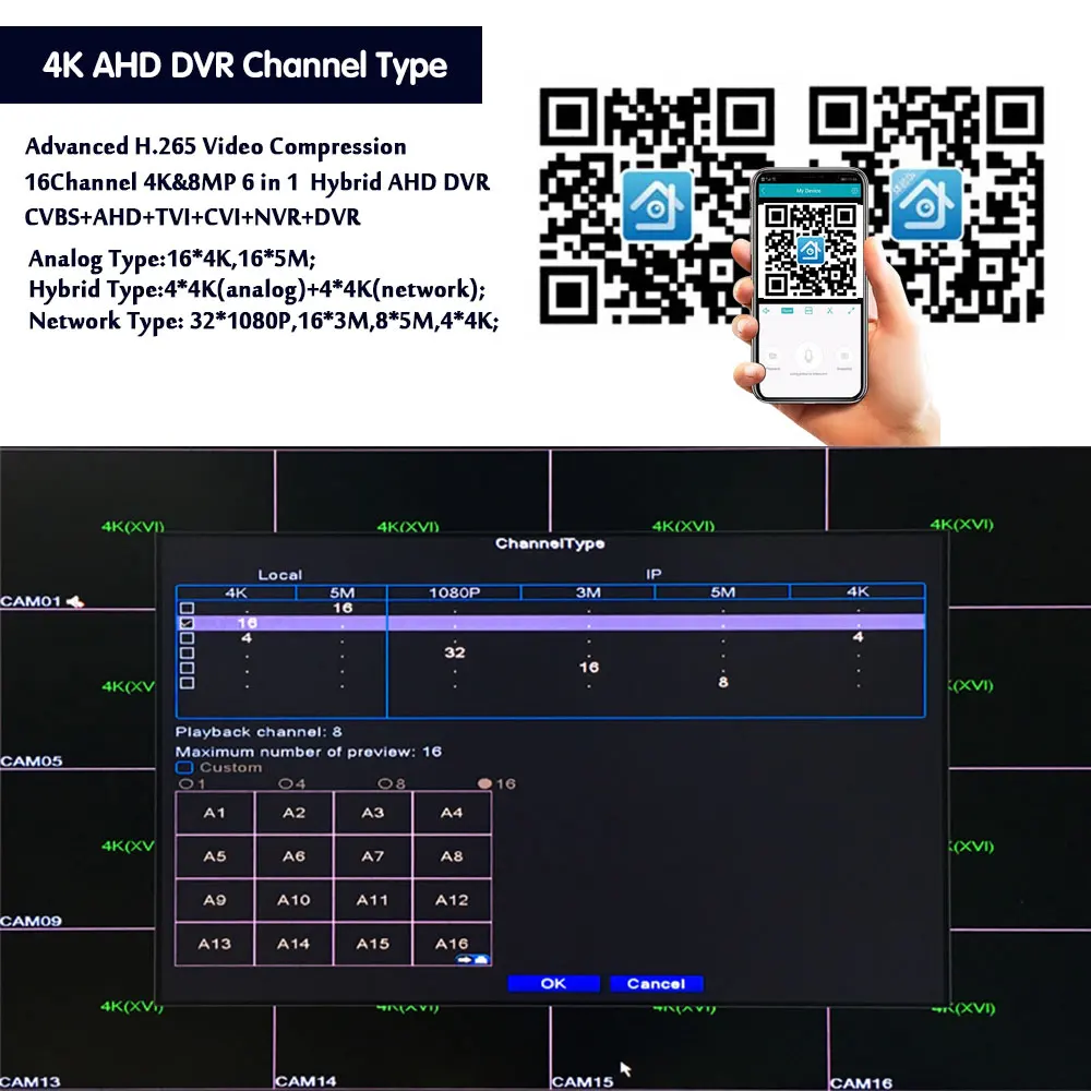 16CH 4K 8MP 5MP Гибридный AHD DVR Обнаружение движения CCTV видеорегистратор 16 каналов DVR камера системы безопасности