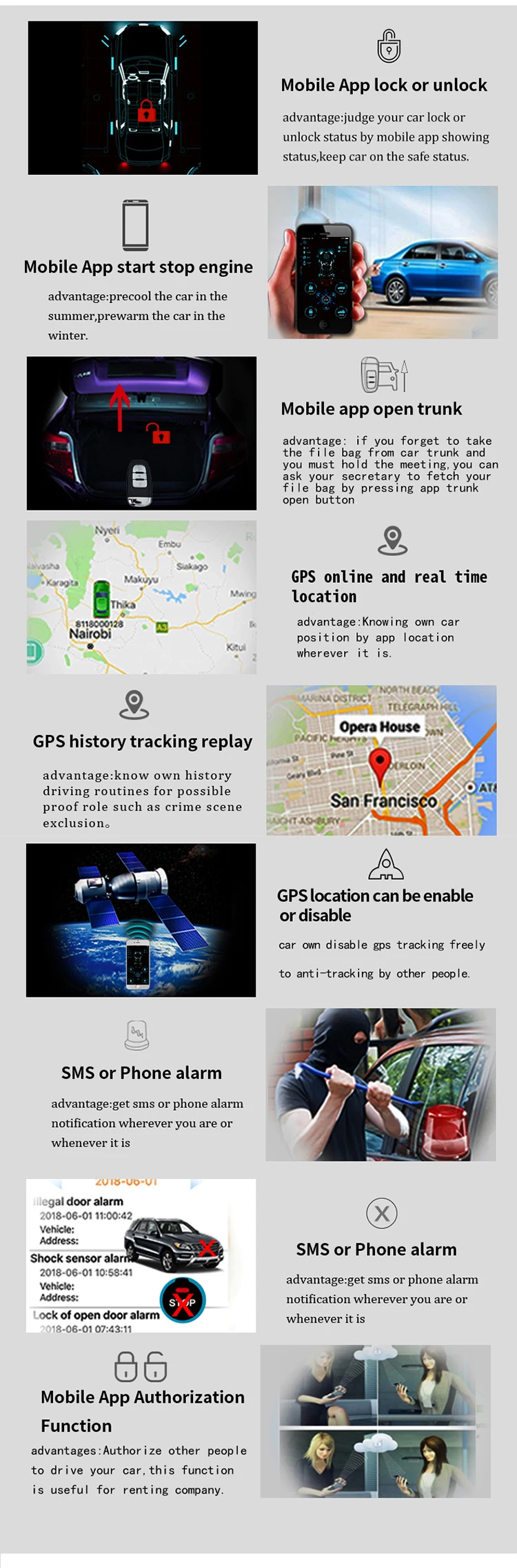 FunctionGPS / GSM, Keyless Entry, Remote Starter, Other, APP Control, Trunk Release, Car Finding, Engin Starter