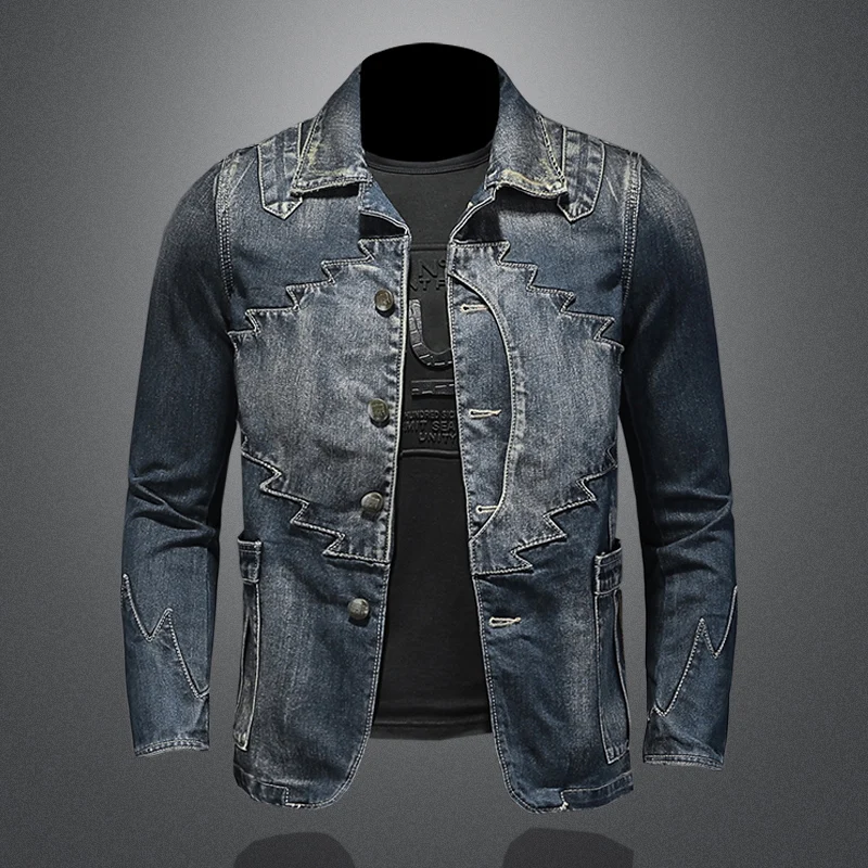 Мужская джинсовая куртка, однотонная однобортная приталенная мотоциклетная куртка в стиле ретро, с длинным рукавом, весна-осень 2021