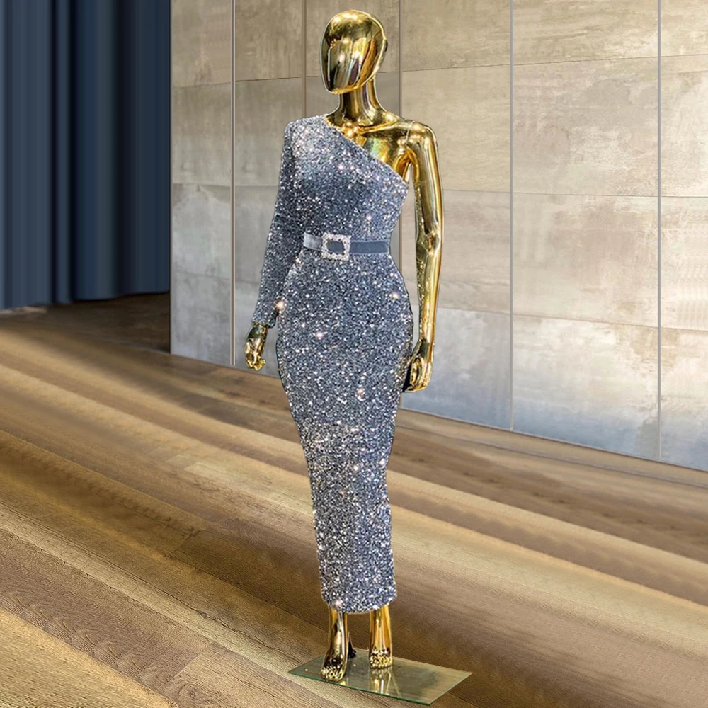 Женское блестящее вечернее платье до середины икры, с длинным рукавом