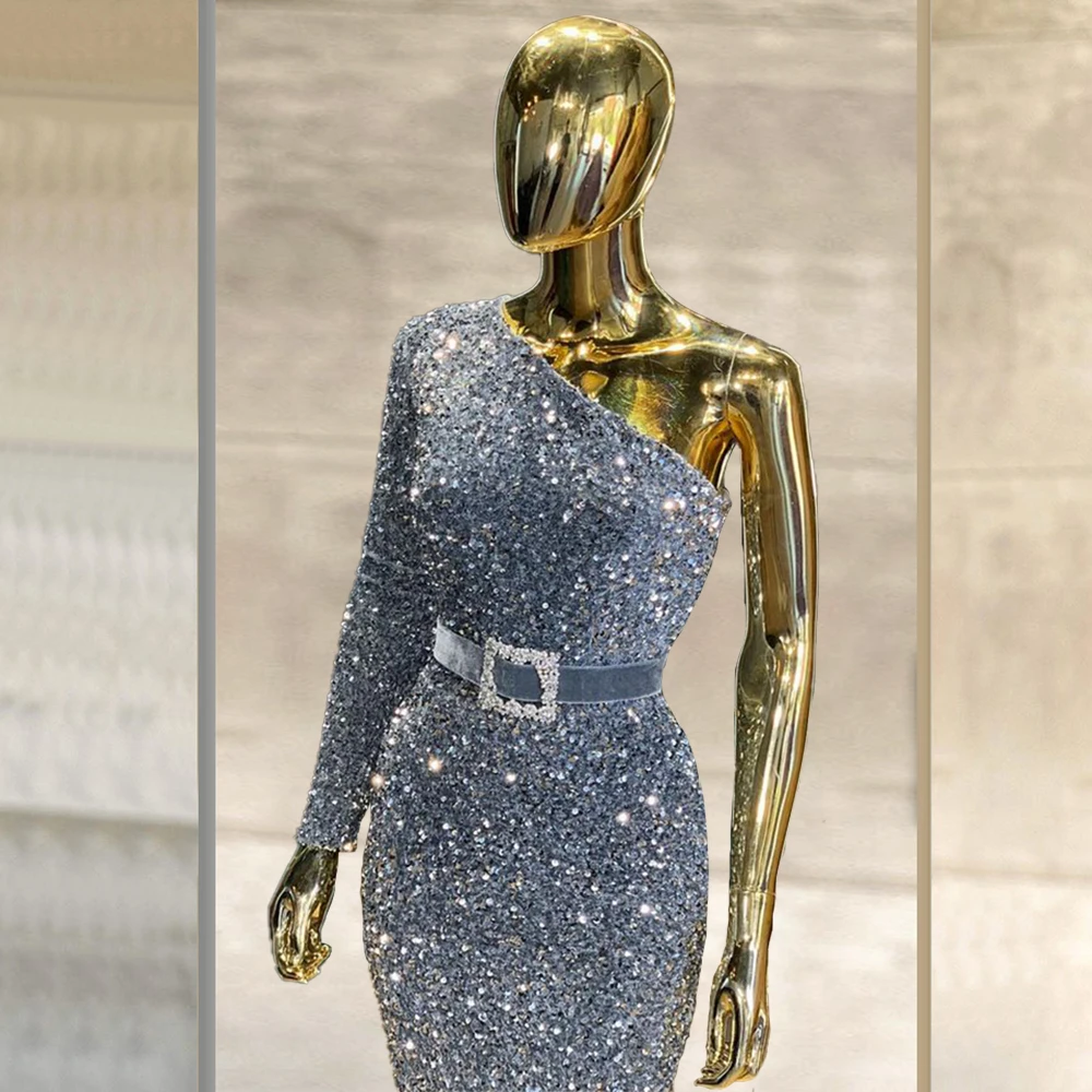Платья для выпускного вечера, серебристые, с одним рукавом, с блест...