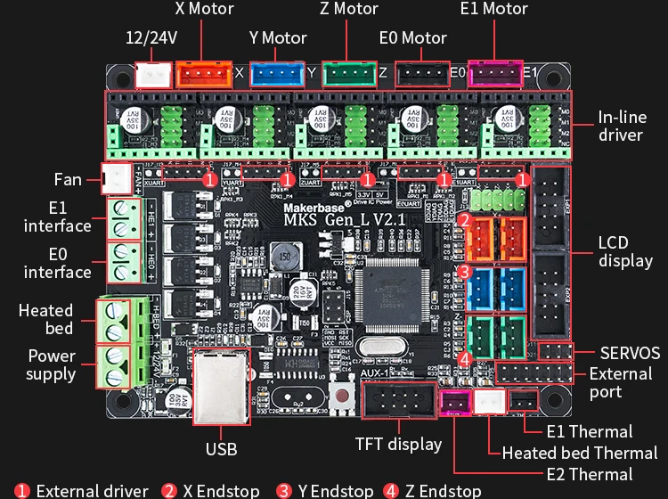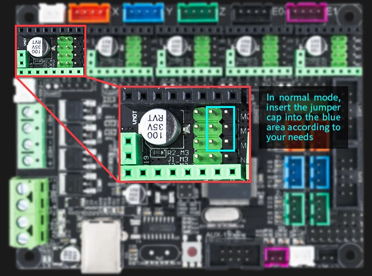 По сравнению с V1.0, V2.1 можно легко включить шаговый Драйвер TMC перемычками. Нет необходимости в проводке кабеля. Например: режим TMC2130 SPI, режим TMC2208/2209 UART. Сборка с высококачественным MOSFET, который хорошо охлаждается и обеспечиваетСтабильная работа в течение длительного времени. Используйте специальный чип питания, который имеет превосходное охлаждение и стабильное электричество. Принять стабильную и надежную схему фильтра для уменьшения помех. Улучшает производительность печати. Высоко, улучшите MOSFET охлаждение подогреваемой кровати. Легко и безопасно собирать двигатели, драйверы и концы в разных цветах. Внимание: при загрузке прошивки отсоедините все детали от платы.Больше функций, как указано ниже