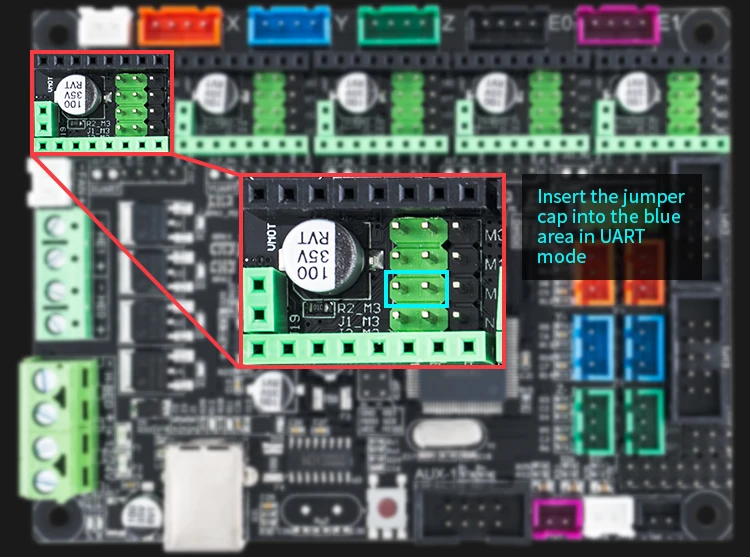 2. Режим Uart (MKS TMC2208 V2.0), когда двигатель находится в режиме UART, текущий и рабочий режим можно настроить непосредственно через прошивку marlin. Как показано на следующем рисунке 1. Все колпачки перемычки на драйвере должны быть вывезены. (запрещено вставлять колпачки перемычки на драйвер) 2. Вставьте колпачки перемычки в области UART pin материнской платы. 3. Настройка параметров драйвера с помощью прошивки marlin (см. Таблицу данных для подробной информации)