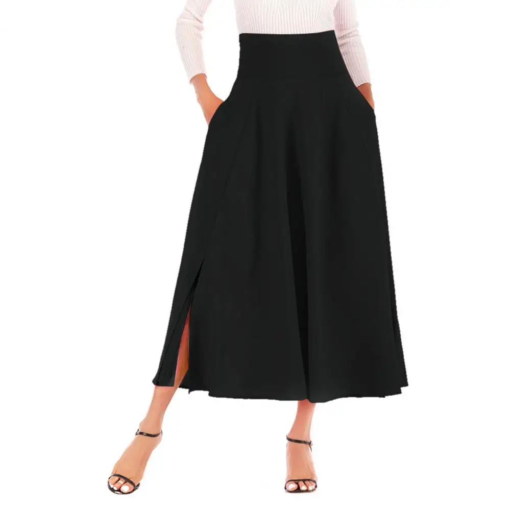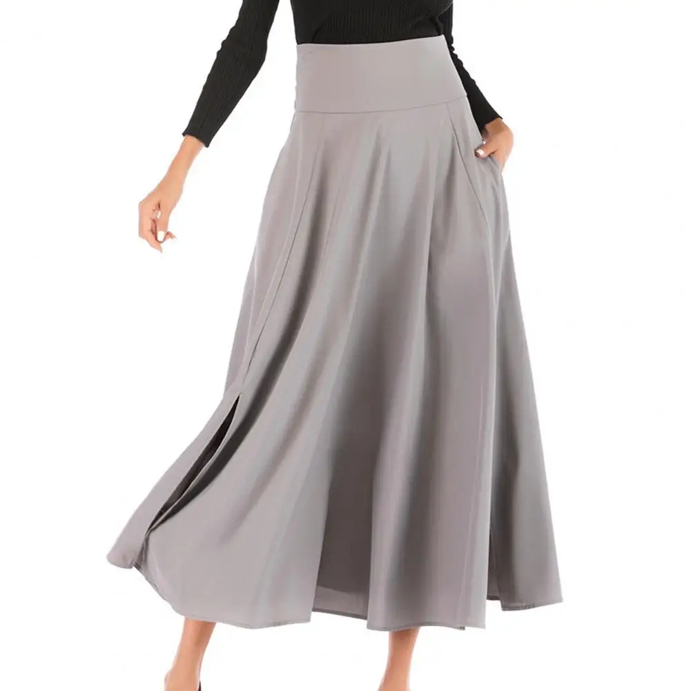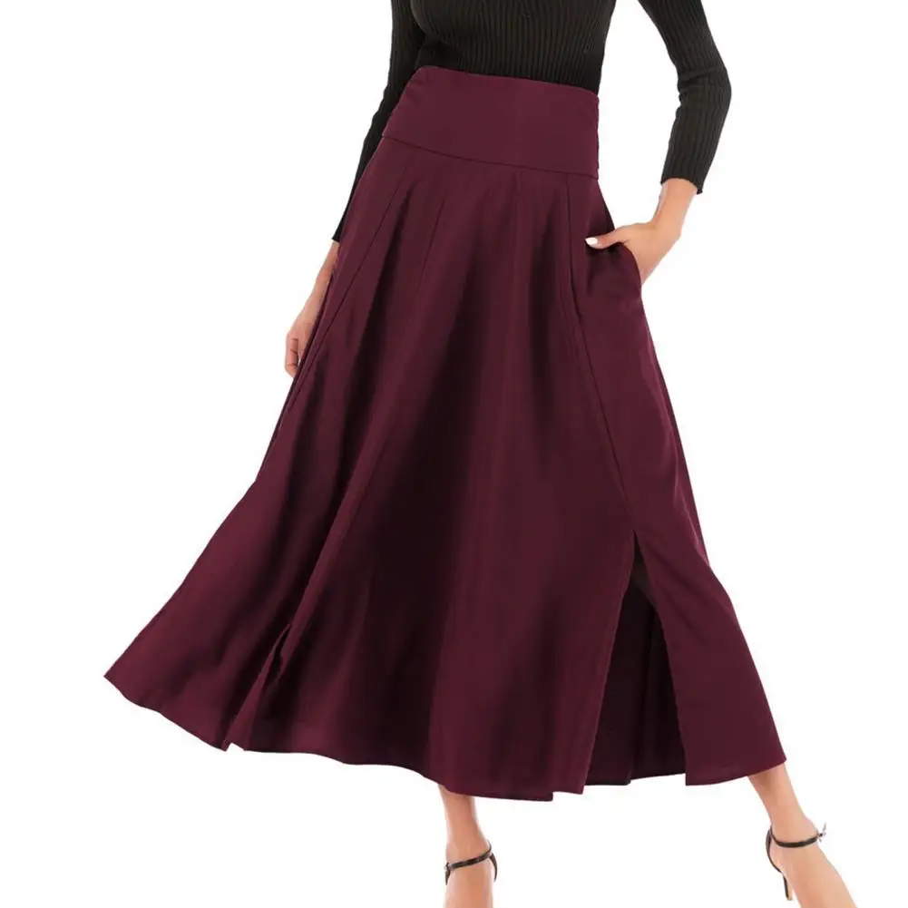 Женская юбка с высокой талией, Повседневная Длинная юбка с боковыми карманами, трапециевидная юбка для женщин, женские юбки с разрезом сбоку