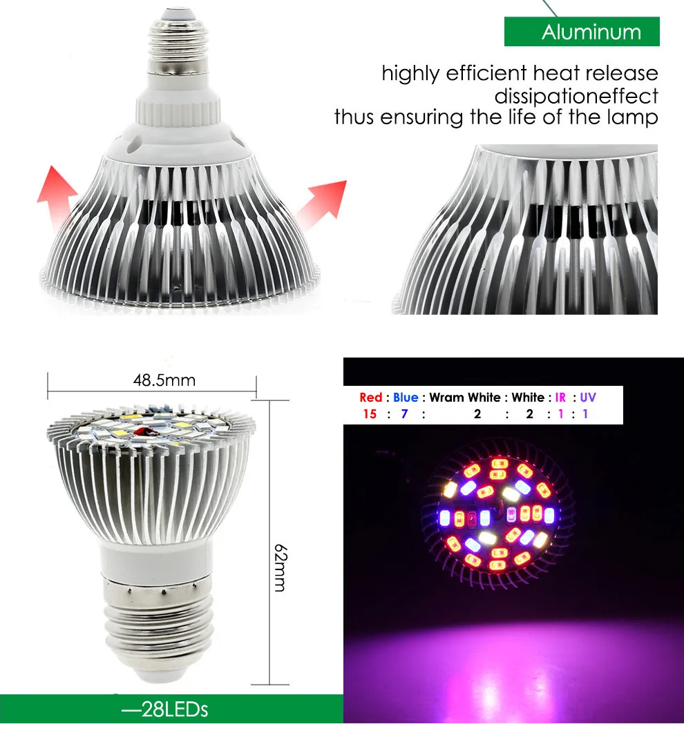 Приглашаем купить высококачественную лампу для выращивания растений.Характеристики Товара:Товар: лампа для роста растенийСВЕТОДИОДНЫЕ Чипы: 2835 SMDКоличество СВЕТОДИОДНЫЙ одов: 18 светодиодов/28 светодиодныйВходное напряжение: 85-265 В переменного токаСрок службы: 50000 часовТип цоколя: E27/E14/B22/GU10Эффекты спектрального диапазона на физиологию растений:Нм ~ нм влияние на морфологические и физиологические процессы минимальное.2,315 нм ~ нм хлорофилл поглощает меньше света, предотвращая удлинение стебля.3,420 нм ~ нм (синий) хлорофилл и каротиноиды поглощают наибольшую долю, оказывая наибольшее влияние на фотосинтез.Скорость впитывания красителя невысокая.«Высокая» скорость поглощения-нм (красный), оказывает значительное влияние на фотосинтез и фотопериодический эффект.Скорость поглощения-нм, стимулирует клеточное удлинение, цветение и прорастание семян.7.> 1000 нм преобразуется в калории.Особенности:Полный спектр, необходимый и критический для роста и цветения растений (от посадки до сбора).Зеленые растения, похожие на 525 нм, выглядят так же. Более здоровым, если растения имеют достаточно зеленый вид.450 нм Синий и 630 нм красный ускоряет рост листьев.Красный цвет 660 нм способствует цветению.Белый 3500k заменяет HPS,HID,MH.Идеально подходит для небольших ящиков для выращивания, палатки для выращивания, гидропоники «сделай сам», бонсая, сада и т. д.Удобные, гуманные и высокоэффективные.