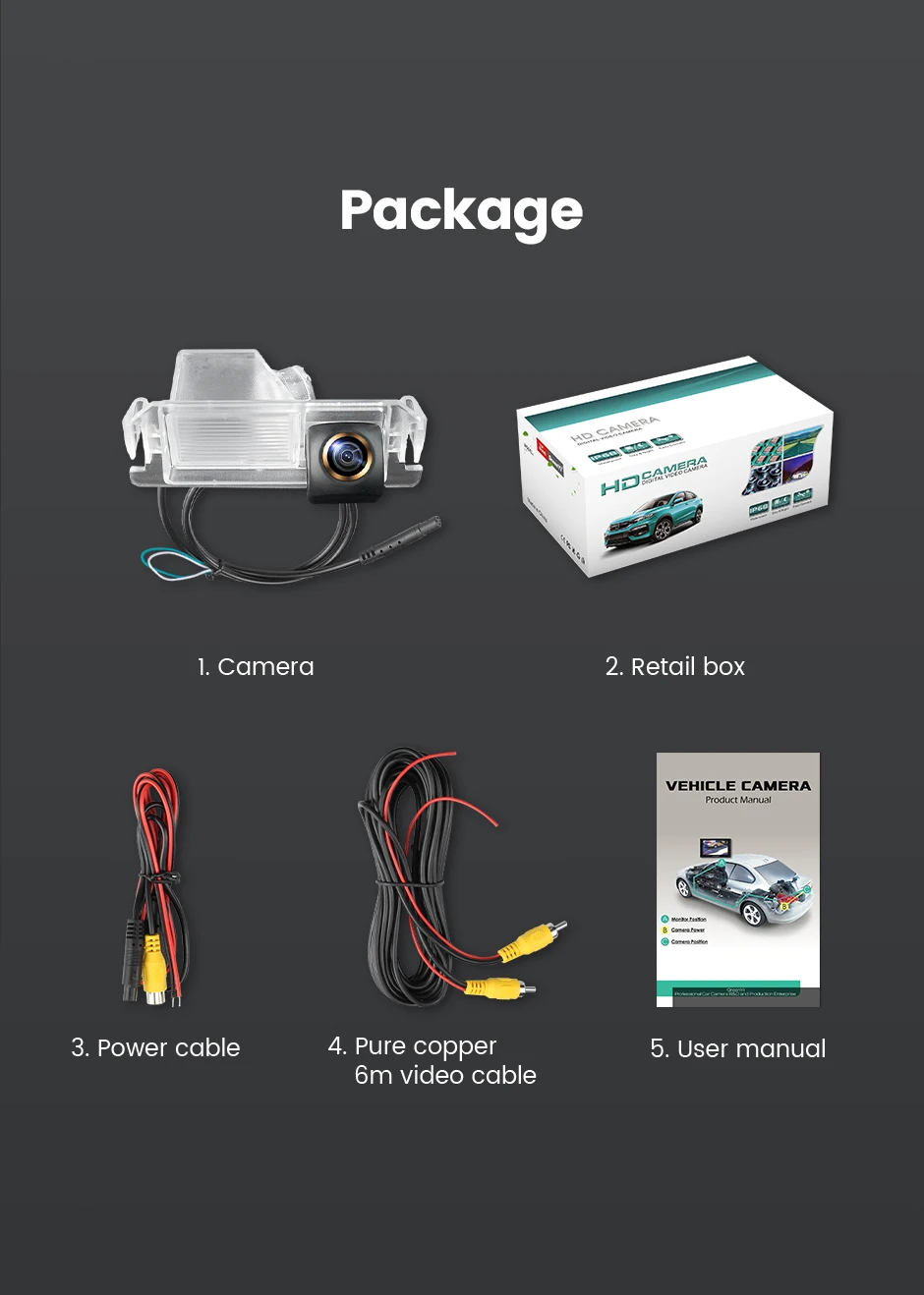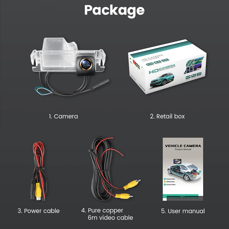 1. Камера заднего вида2. Розничная коробка3. Кабель питания4. Чистый медный 6 м видео кабель5. Руководство пользователя