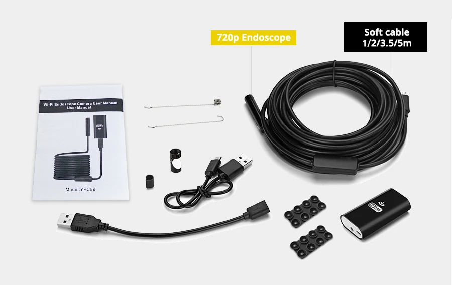1 x WiFi эндоскоп с WiFi коробкой1 х маленький крючок1 х Магнит1 х боковое прослушивание1 x Зеркало1 х Руководство