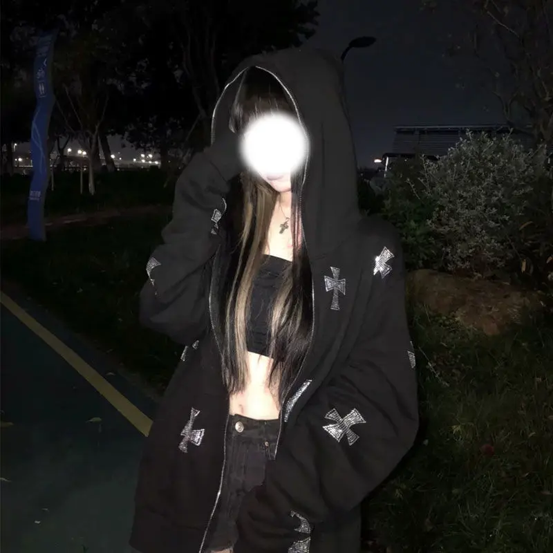 Толстовка Стразы в готическом стиле на молнии, свитшот большого размера в стиле Харадзюку, хип-хоп, одежда в стиле панк, пуловер на молнии