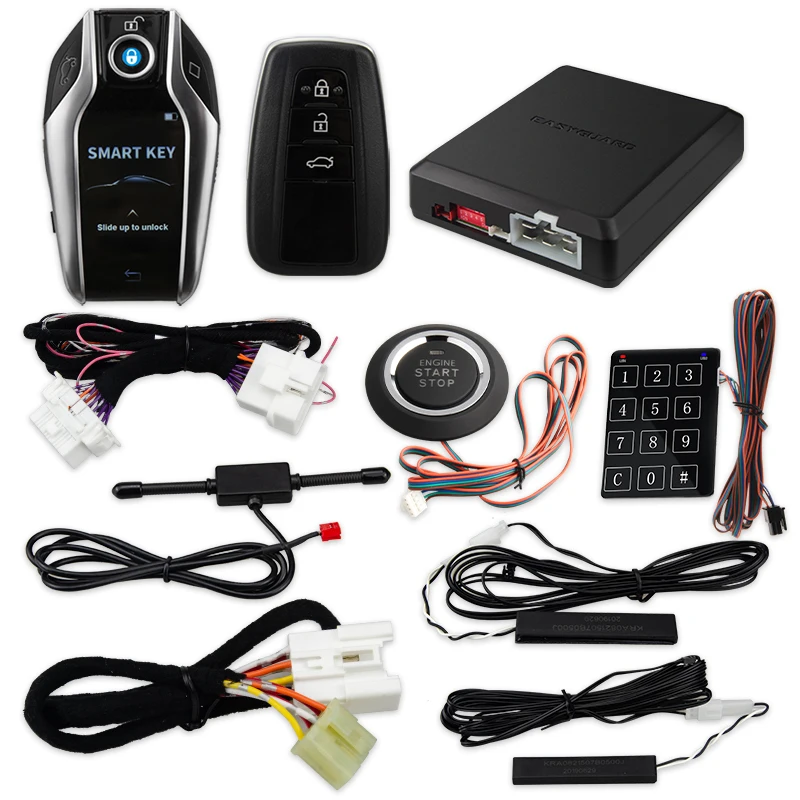 Уважаемый клиент,Это ec002-t2-L PKE сигнализация от EASYGUARD с пуском двигателя и функцией удаленного запуска двигателя. И один универсальный ключ и один перезаряжаемый ЖК-ключ