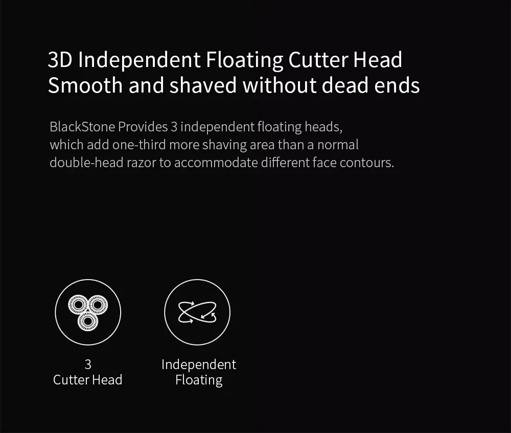 Эта Бритва имеет три набора независимо плавающих резцов, которые добавляют 1/3 области бритья, чем обычная двойная режущая бритва. Режущая головка имеет гладкий сенсорный и эластичный шпон, чтобы адаптироваться к различным контурам лица.
