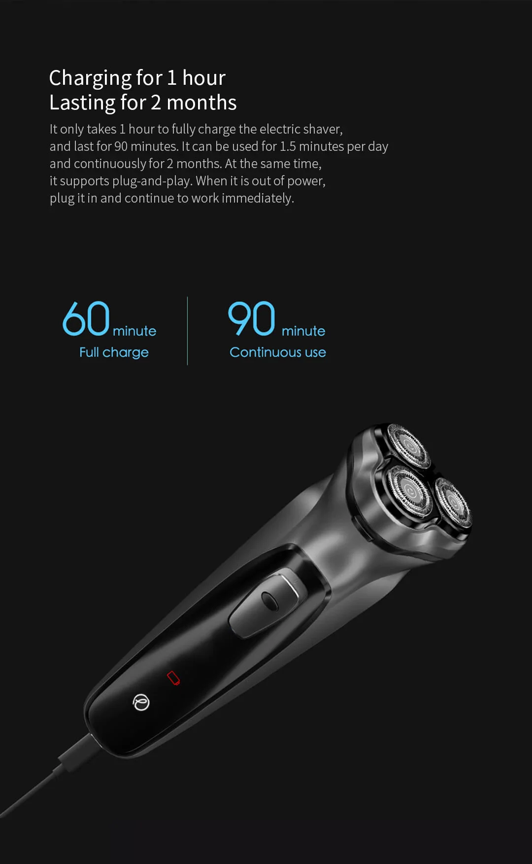 Когда батарея низкая, бритва держит скорость бритья постоянной и позволяет избежать прижимания бороды на низкой скорости.