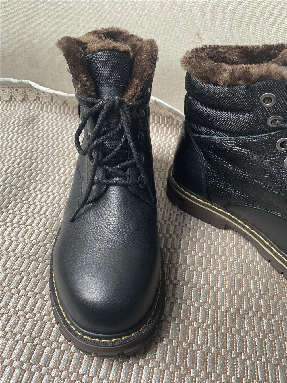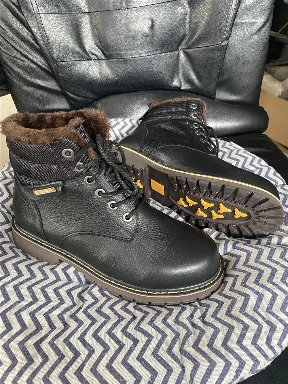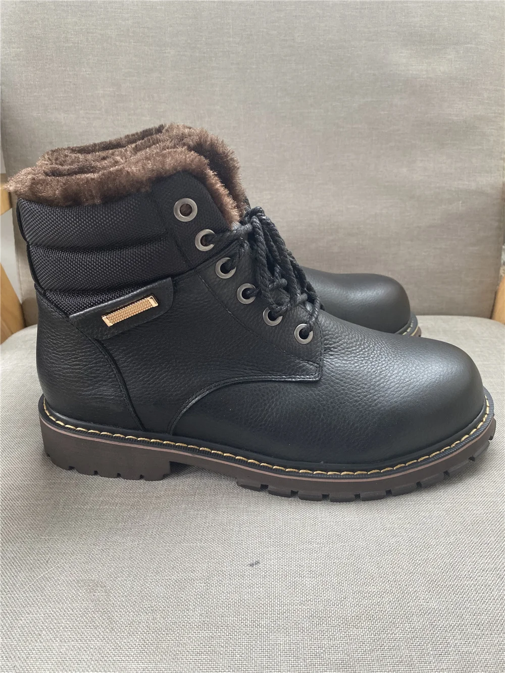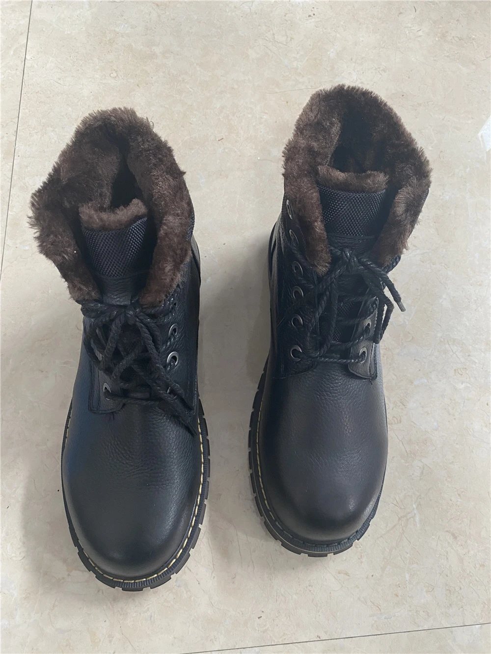 Ботинки точно как на фото. Сделано качественно, строчки ровные, всё добротно. Продавец общительный, по моей просьбе менял размер уже после заявки. Внутри мех исскуственный, но мягкий и тёплый . Снаружи, мне кажется, кожа. Запах как у новой обуви, незначительный, приятный. для зимы самое то. Подошва солидная, каучуковая, хорошо гнется, думаю не скользкая. Если в процессе носки проявит себя хорошо, то отличный товар за такие деньги. Заказ шел 20 дней. Спасибо продавцу, удачи в бизнесе.