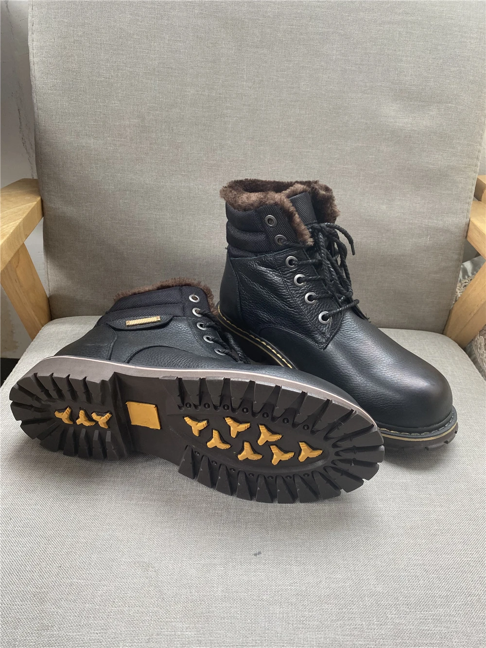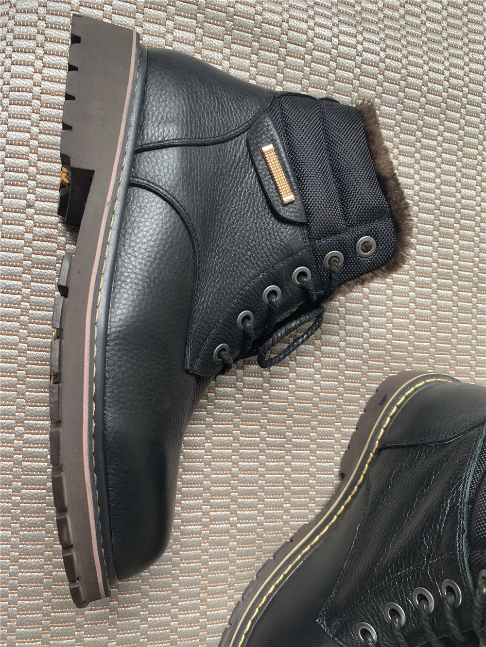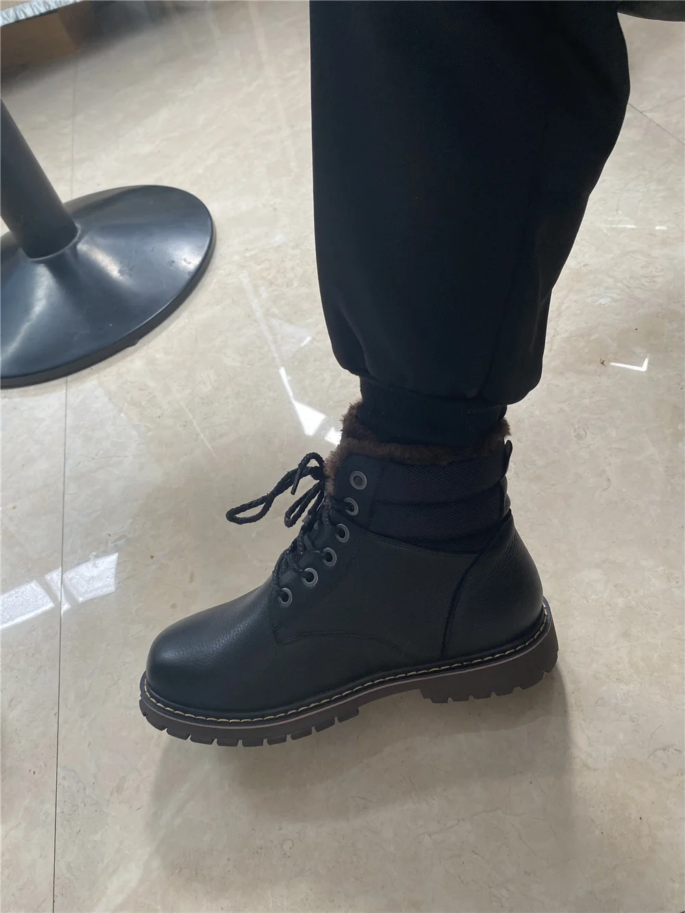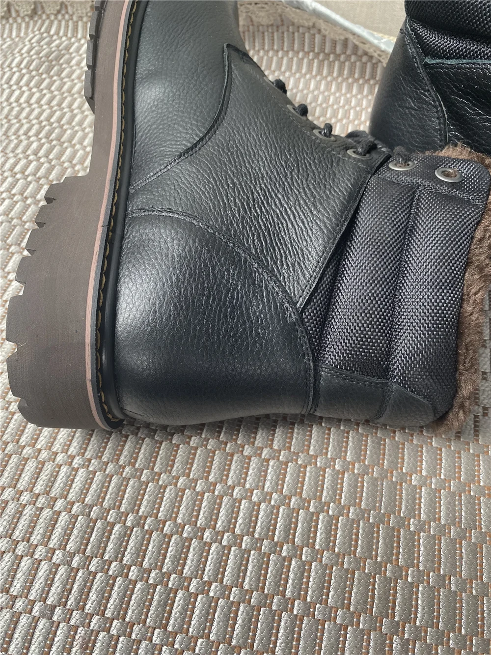 Ботинки точно как на фото. Сделано качественно, строчки ровные, всё добротно. Продавец общительный, по моей просьбе менял размер уже после заявки. Внутри мех исскуственный, но мягкий и тёплый . Снаружи, мне кажется, кожа. Запах как у новой обуви, незначительный, приятный. для зимы самое то. Подошва солидная, каучуковая, хорошо гнется, думаю не скользкая. Если в процессе носки проявит себя хорошо, то отличный товар за такие деньги. Заказ шел 20 дней. Спасибо продавцу, удачи в бизнесе.