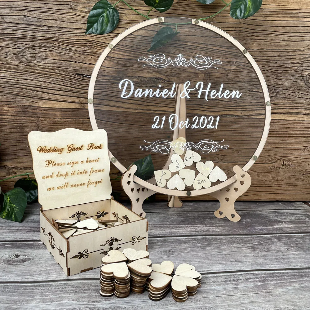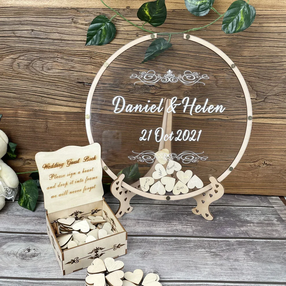 Круглая Свадебная Гостевая книга на заказ, прозрачная круглая акриловая деревянная рамка, персонализированное имя и дата, коробка для гостей на день рождения