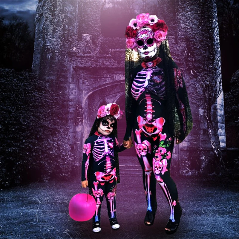 Костюмы на Хэллоуин для девочек, Женский страшный Комбинезон Зентаи, ужасный Розовый Скелет, Одинаковая одежда для мамы и дочки, карнавечерние