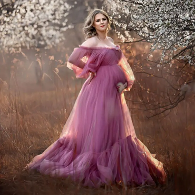 Платье для беременных из тюля, с открытыми плечами, длинными рукавами и оборками