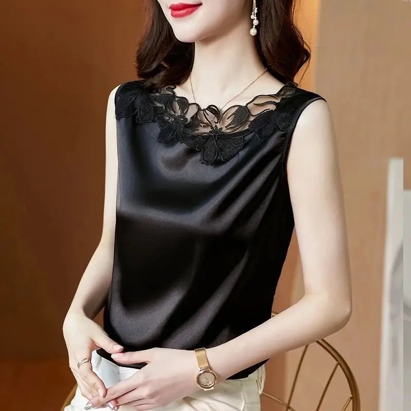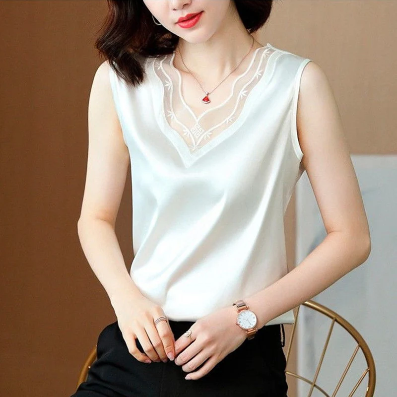 Женский шифоновый топ, рубашка свободного покроя, майка большого размера, атласная кружевная блузка без рукавов с V-образным вырезом, Офисная Дамская блузка, 2021