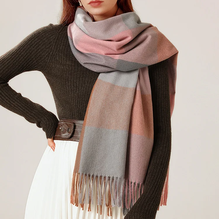 Зимний клетчатый шарф, женская теплая шаль из пашмины, длинные вяза...