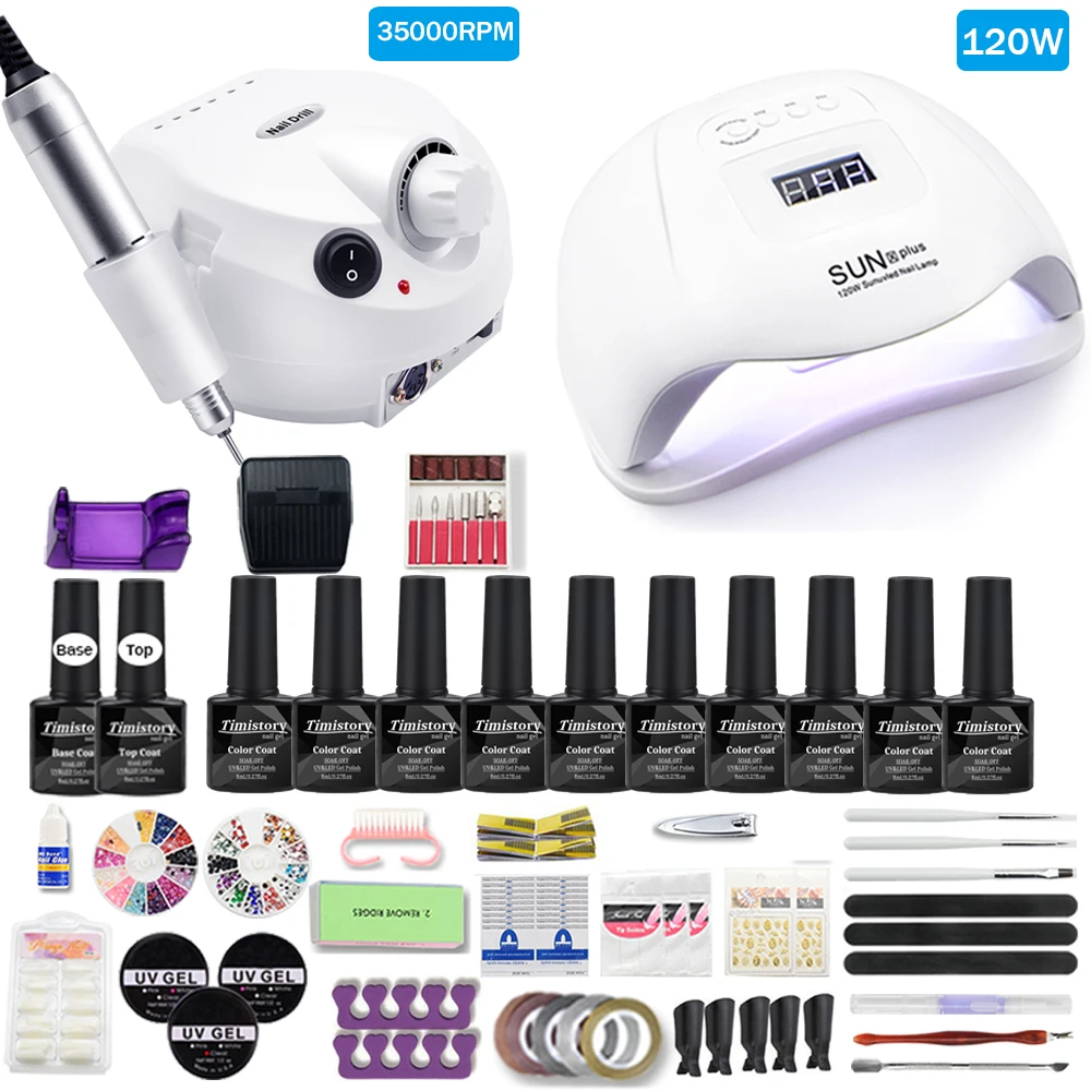 Мощность лампы для ногтей:120 ВтСкорость дрели для ногтей:35000 об/мин/20000 ОБ/минТипы лака для ногтей:Набор цветных гелей, 10 шт.