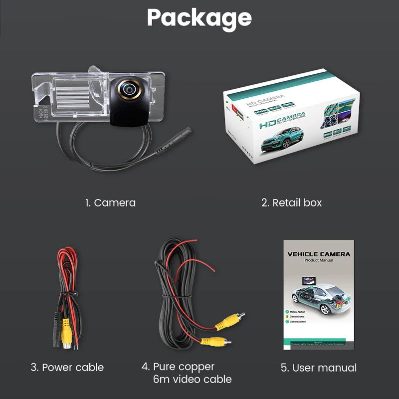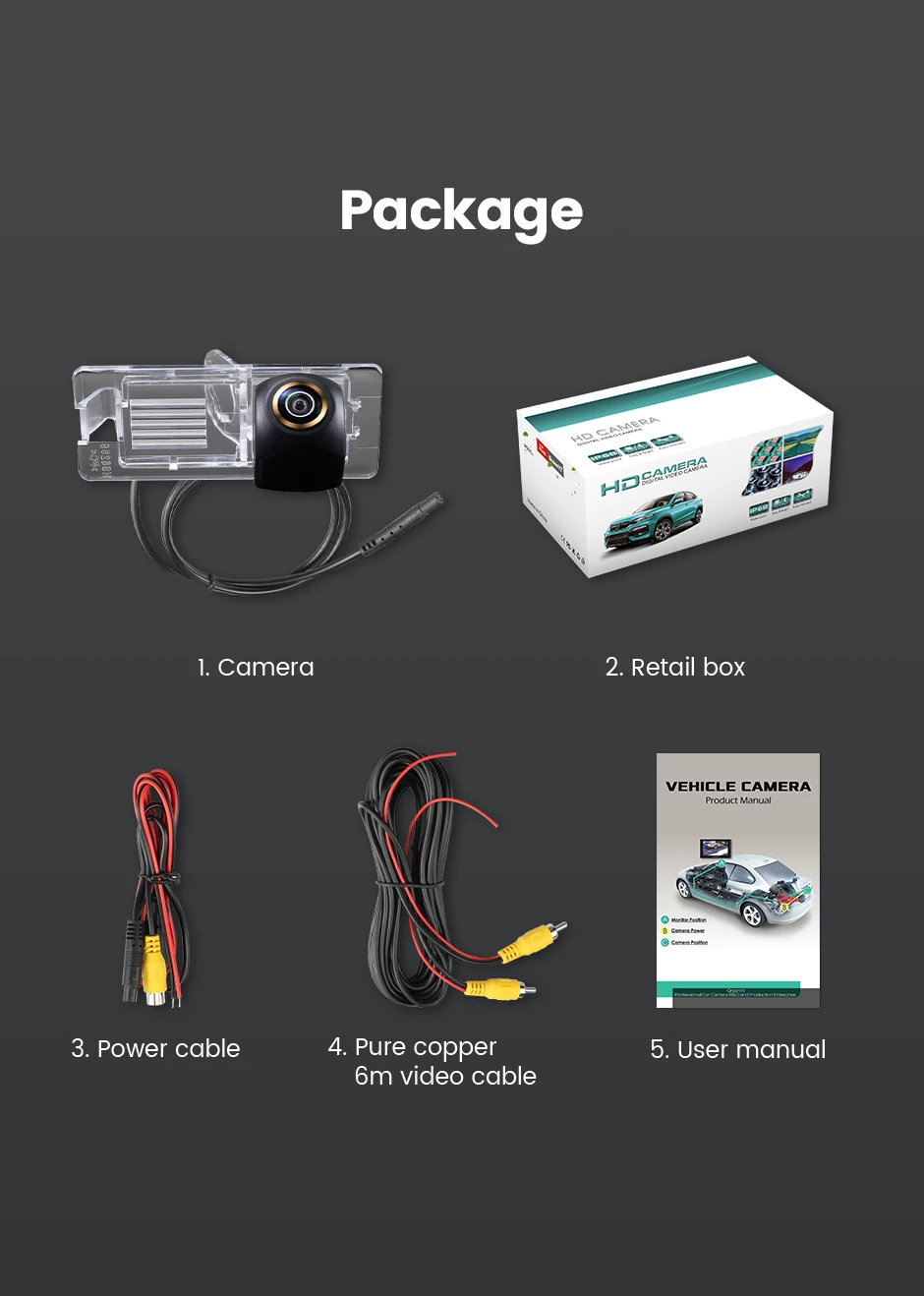 1. Камера заднего вида2. Розничная коробка3. Кабель питания4. Чистый медный 6 м видео кабель5. Руководство пользователя