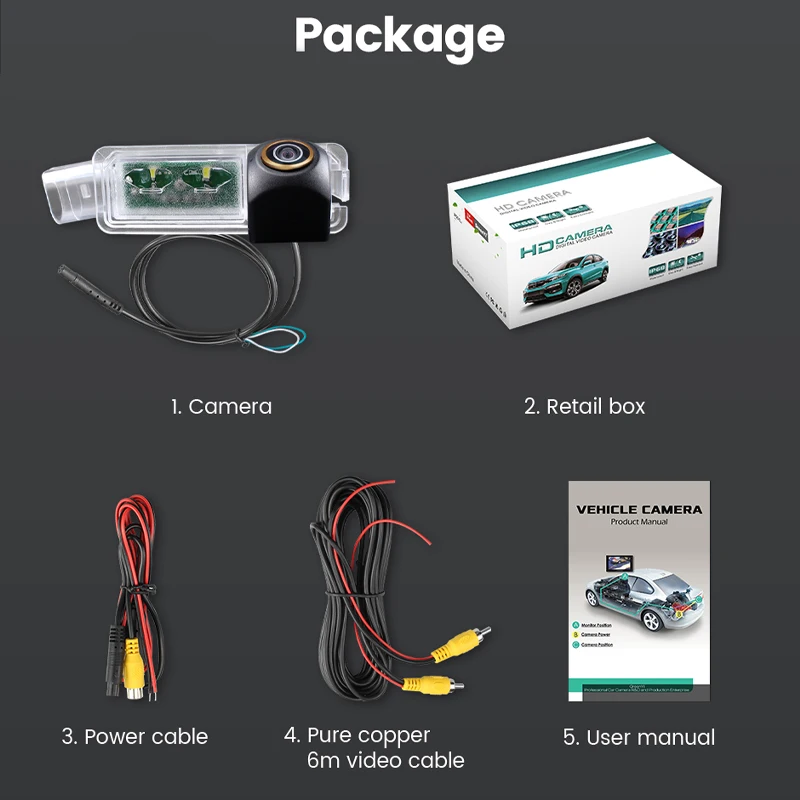 1. Камера заднего вида2. Розничная коробка3. Кабель питания4. Видеокабель из чистой меди 6 м5. Руководство пользователя