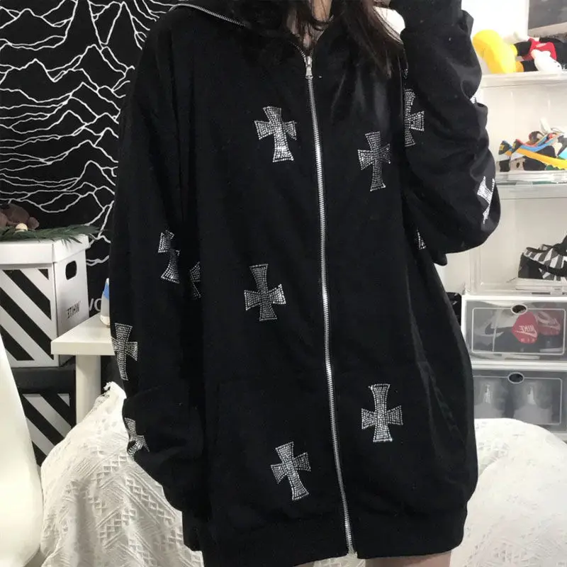 Стразы хип-хоп готический с длинным рукавом черная толстовка на молнии Y2k джоггеры пуловер корейская мода Свитшот 2021 спортивное пальто уличная одежда