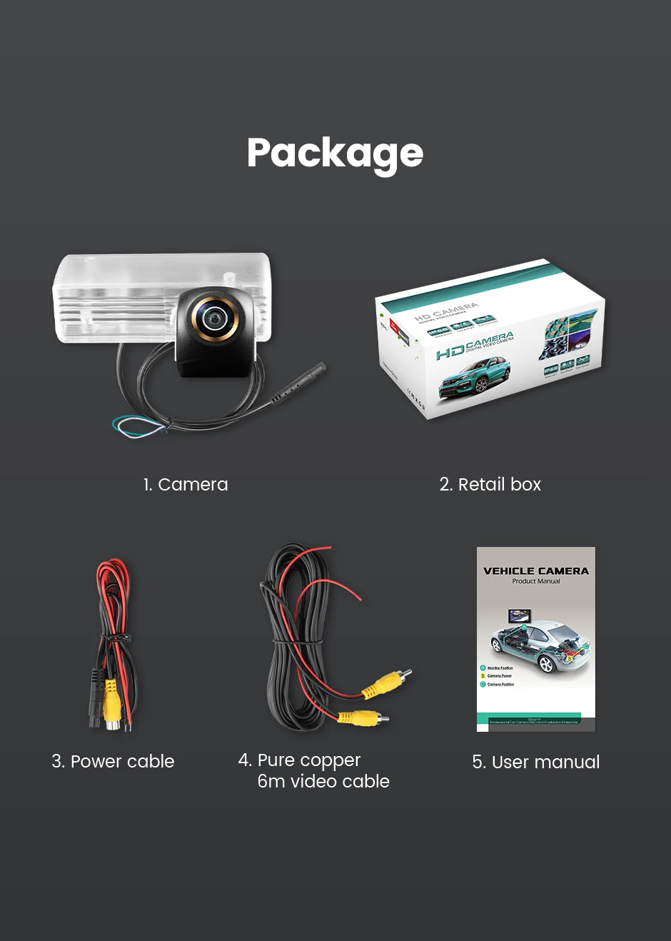 1. Камера заднего вида2. Розничная коробка3. Кабель питания4. Чистый медный 6 м видео кабель5. Руководство пользователя