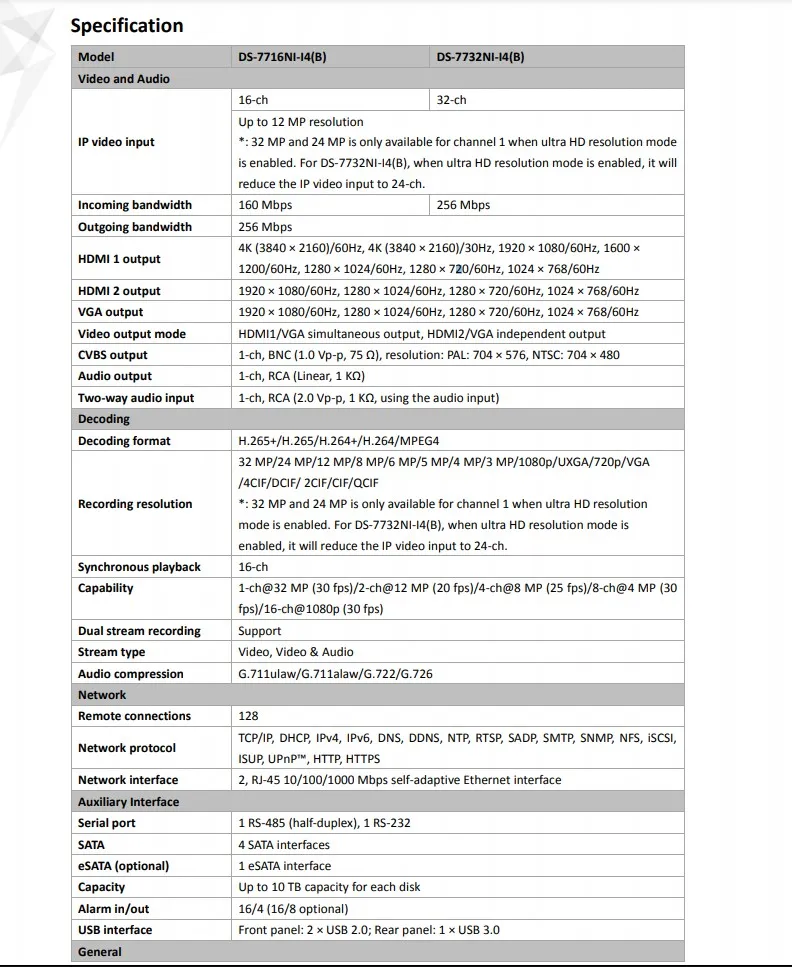 DS-7732NI-I4 32-канальный 1.5U 4K NVR Можно подключить ip-камеры до 32 каналов До 1-ch @ 32 MP/2-ch @ 12 MP/16-ch @ 1080p Емкость декодирования Только (B) версия поддерживает 2 HDMI и 1 VGA интерфейсы, и HDMI интерфейсы поддерживают независимый видеовыход 4 HDDs для непрерывной записи видео Поддерживает различные специальные функциональные камеры, включая тепловую камеру/рыбий глаз/людей подсчета/тепловая карта/ANPR (автоматическое распознавание номерных знаков) Усовершенствованная технология потоковой передачи обеспечивает плавный просмотр в реальном времени и самокоррекцию данных в плохих условиях сети Поддержка записи двойного потока для экономии времени и полосы пропускания. Профессионализм и надежность Сжатие H.265 + эффективно уменьшает пространство для хранения до 75% Одновременная двухпотоковая запись экономит пропускную способность Использует технологию шифрования потока по TLS, которая обеспечивает более безопасный сервис передачи потока Поддержка двойной проверки для воспроизведения и загрузки HD видео выход Монопод обеспечивает независимые HDMI и VGA выходы Выходное видео HDMI с разрешением до 4K Хранение и воспроизведение Подключайте до 4 интерфейсов SATA для подключения HDD Синхронное воспроизведение 16-ch Функция Smart & POS Поддержка нескольких событий VCA (видео-контент-аналитика) Настраиваемые Специальные Смарт-функции камеры, такие как обнаружение VCA (motion, Пересечение линии, вторжение и т. д.), тепловая карта, ANPR, и Подсчет людей Обновленная информация POS Наложение на просмотр и воспроизведение в реальном времени, и ПОС срабатывает запись и будильник Доступ к сети и Ethernet 2 самоприспосабливающаяся 10/100/1000 Мбит/с Ethernet интерфейсов Hik-Connect & DDNS (система динамических доменных имени) для удобного управления сетью Технология непрерывной передачи данных Поддержка веб-доступа через usb-порт без подключения