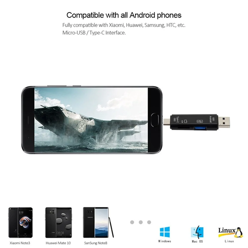 Описание:Состояние на 100% абсолютно новый и высокое качество!Название продукта: Тип-c 5-в-1 OTG кард-ридерЦвет: черный, белыйМатериал: экологически чистый материал ABSФункция продукта: USB2.0 male + MICRO male + Type-C male, Быстродействующее считывание карт памяти TF, внешняя клавиатура с интерфейсами USB male, мыши, флеш-накопители USB, usb-экраны, геймпады и другие usb-устройства.Вспомогательное оборудование: мобильные телефоны, Mac_book (USB Type-C), ноутбуки, обычные компьютерыСовместимость с несколькими системами: Поддержка Micro / Usb / Type-c / TFПродукт Размеры: около 7,5*1,7*1,0 см