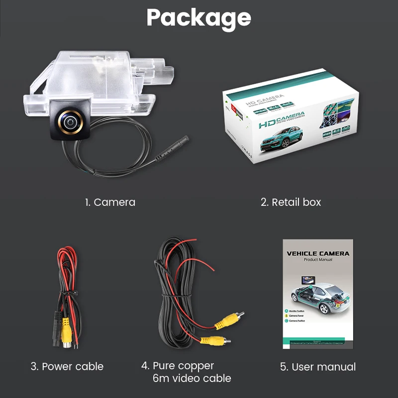 1. Камера заднего вида2. Розничная коробка3. Кабель питания4. Чистый медный 6 м видео кабель5. Руководство пользователя