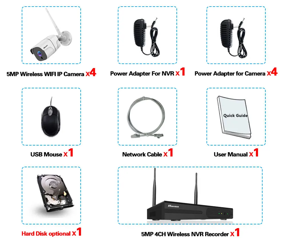 1X 4-канальный 5-мегапиксельный Беспроводной Wi-Fi видеорегистратор;4 беспроводные IP-камеры Ultra HD 5 Мп с Wi-Fi;4X Блок питания для камеры;1 источник питания для сетевого видеорегистратора;1 USB-мышь (подарок);1x3 фута 1 м кабель Ethernet (подарок);1 Краткое руководство;Жесткий диск опционально!