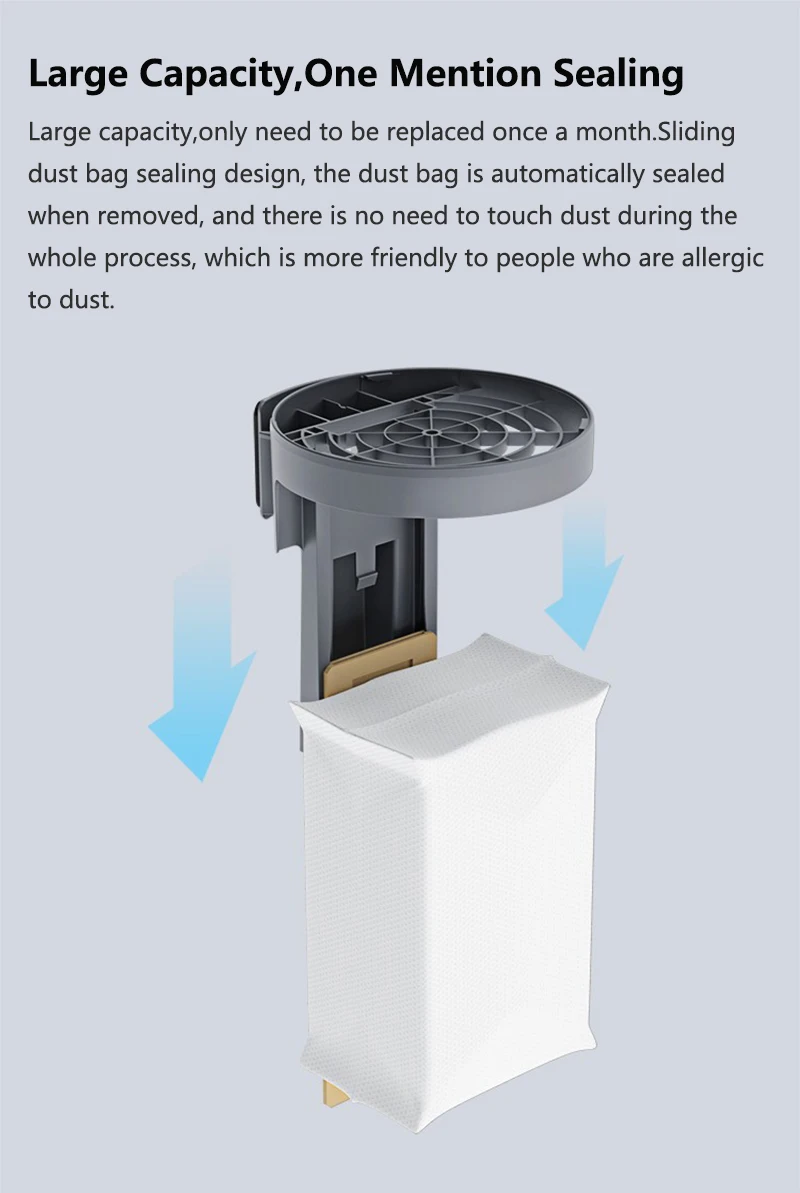 Большая емкость, нужно заменить только один раз в месяц. РаздвижныеПылезащитный мешок запечатывания, мешок пыли автоматически запечатанПри удалении, и нет необходимости касаться пыли во времяВесь процесс, который более дружелюбен к людям, у которых есть аллергияОт пыли.