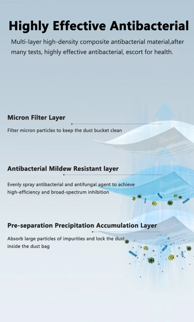 Многослойный композитный антибактериальный материал высокой плотности, после многих тестов, высокоэффективный Антибактериальный, сопровождение для здоровья.Микрон фильтрующий слойФильтр микрон частиц, чтобы держать ведро пыли в чистотеАнтибактериальный устойчивый к плесени слойРавномерно спрей антибактериальный и противогрибковый агент для достижения высокой эффективности и широкого спектра ингибированияСлой для предварительного разделения осадковПоглощает большие частицы примесей и блокирует пыльВнутри пылесборника
