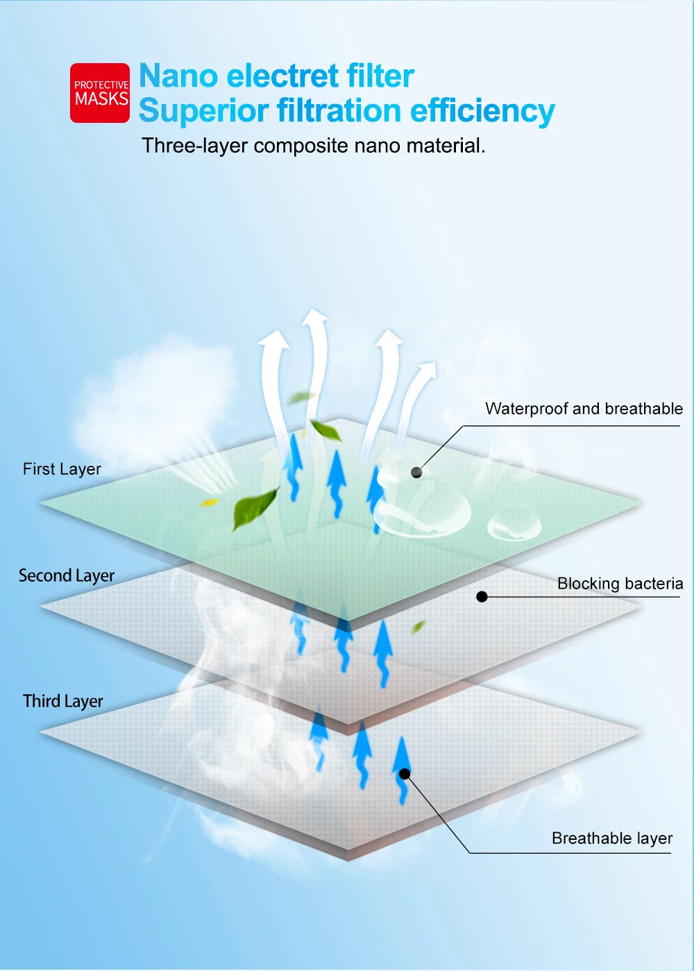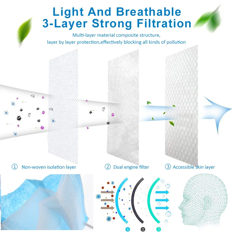 Характеристики материала: 3 слоя нетканого полотна1. Нетканые материалы из полипропилена: эффективно блокирует видимые предметы, такие как капельки2. Расплав выдувных нетканых материалов: фильтрация немасляных частиц в воздухе3. Нетканые материалы из полипропилена: делает кожу сухой и комфортнойХарактеристики: