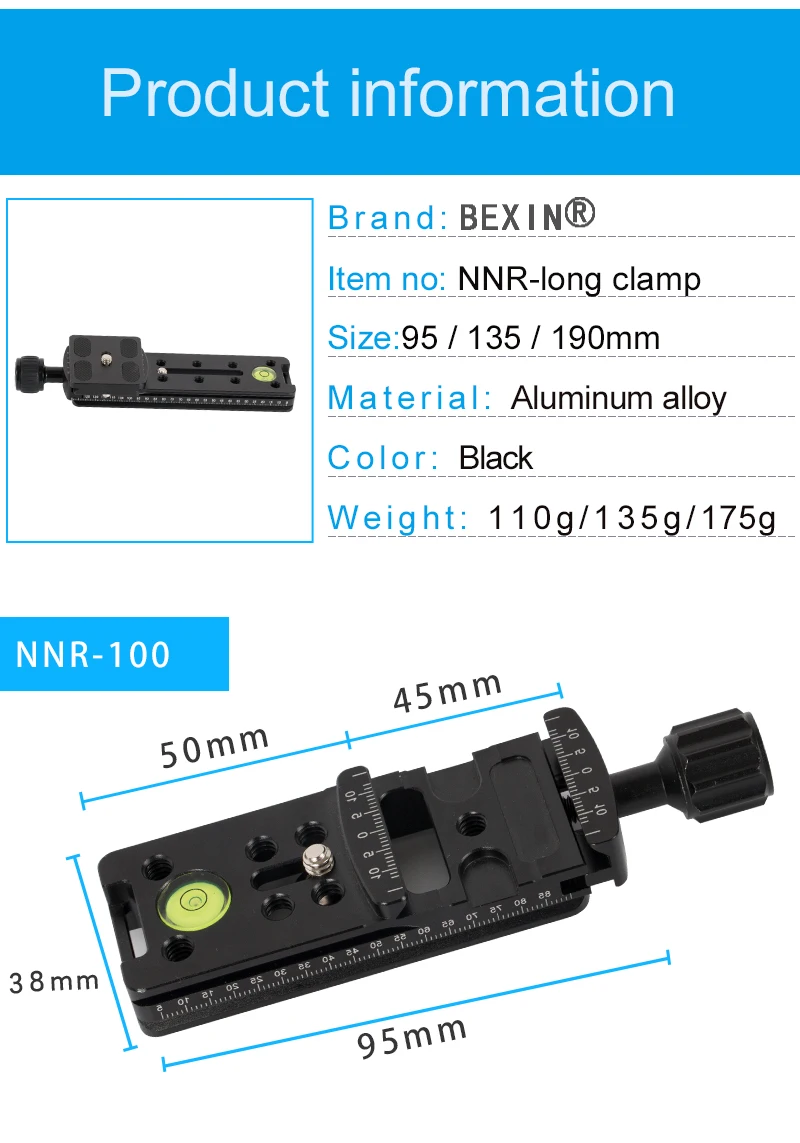 Спецификация:Модель: NNR-100/150/200Материал: алюминийСтандарт зажима: Arca swissСтандарт пластины: Arca swissВес: около 150 гРазмер: 95/135/190*38*34,5 ммШирина пластины: 38 ммТехнология: Анодное окислениеВинт камеры: винт UNC1/4Использование для: штатив для камерыПримечание:1. Возможны отклонения в 1-3 мм из-за ручного измерения.2. Из-за различных дисплеев и другого светильник, изображение может не показать фактический цвет товара. Спасибо за понимание.