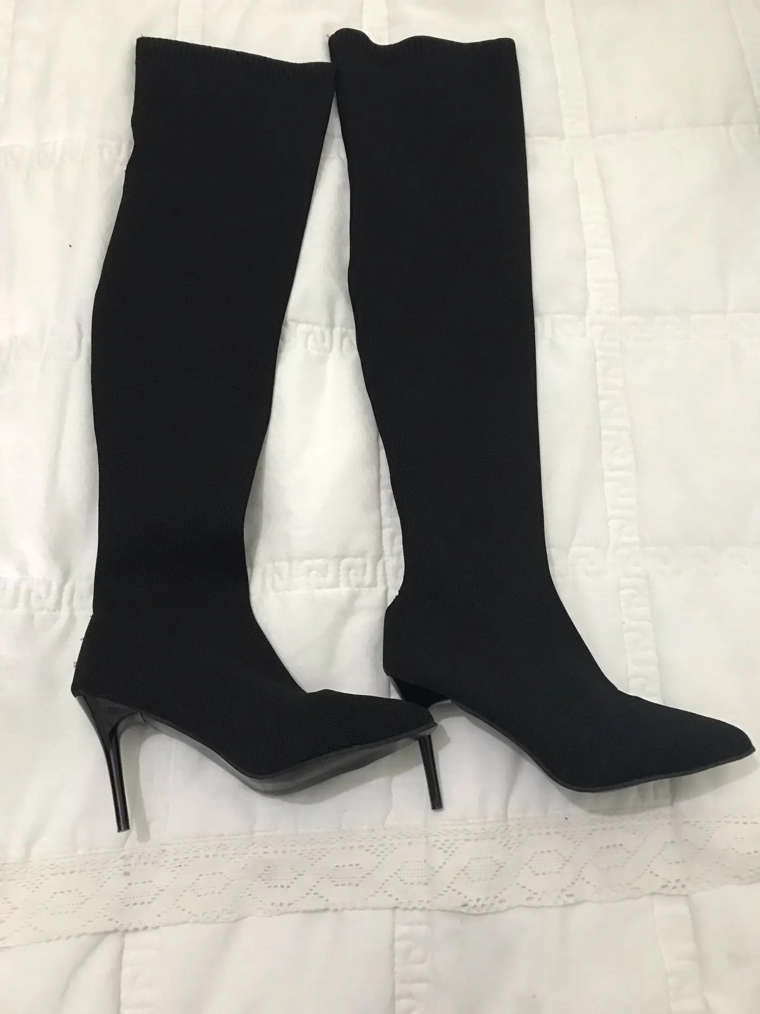 2021 г., зимние женские сапоги выше колена сапоги до бедра из эластичной ткани на высоком каблуке обувь без шнуровки женские черные высокие сапоги с острым носком