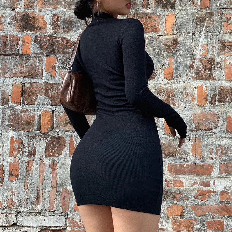 Осенне-зимнее женское сексуальное черное платье с длинным рукавом, женское повседневное однотонное мини-платье на молнии с высоким воротником